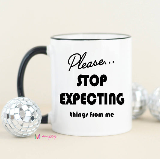 Please Stop Expecting Things Funny Coffee Mug: Black Rim/Handle / 11oz