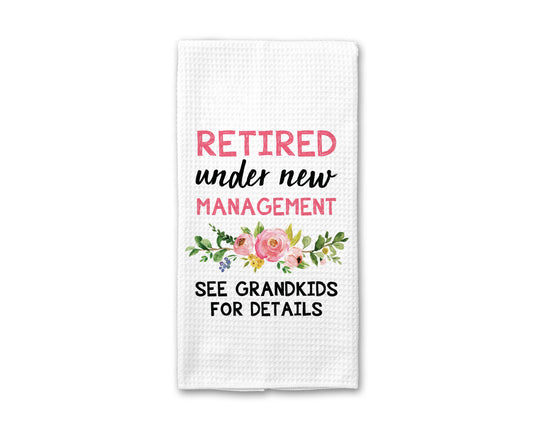 Retired Under New Management Dish Towel, Grandparent Gift: Transparent Cellophane Sleeve with Hanger Flap
