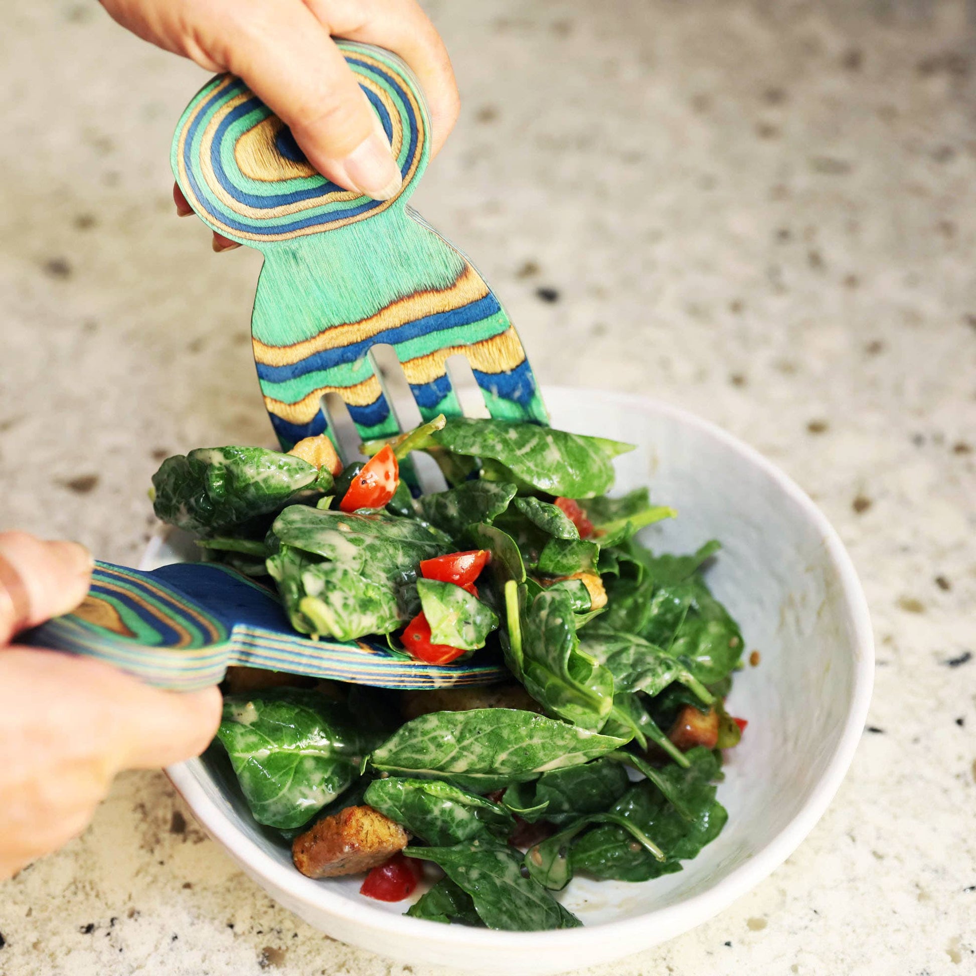 Layers of food safe, colored material make up these unique wood kitchen tools.