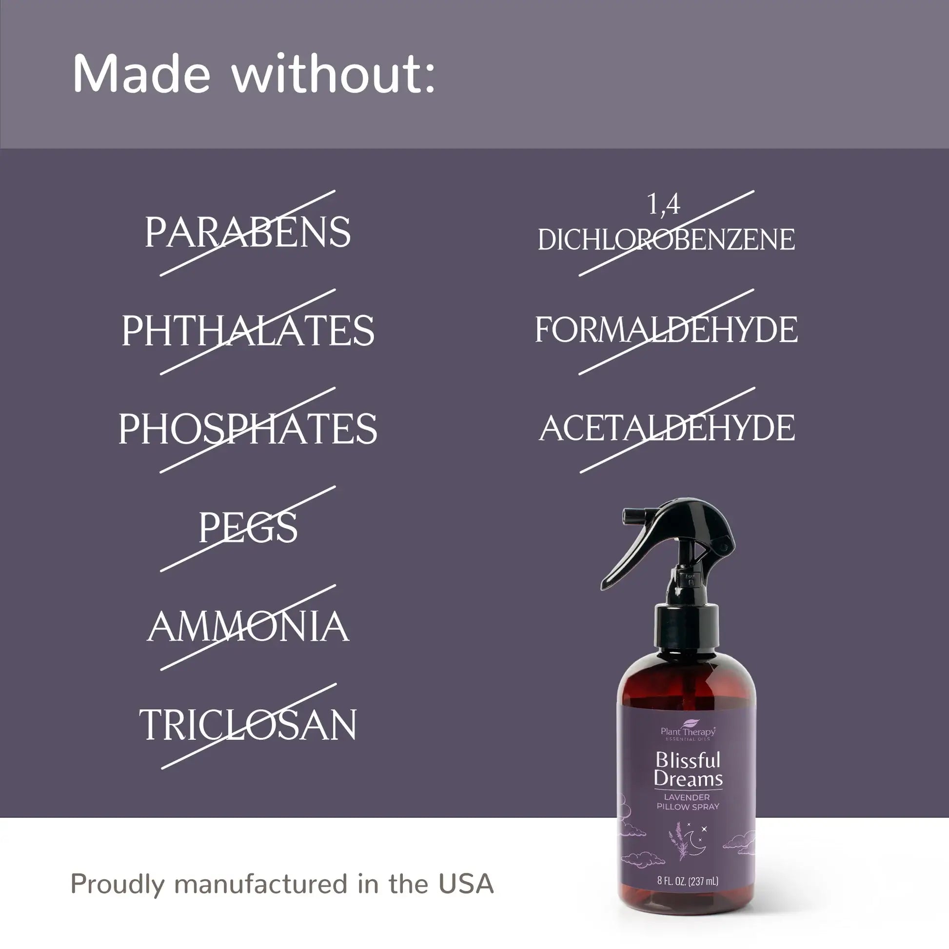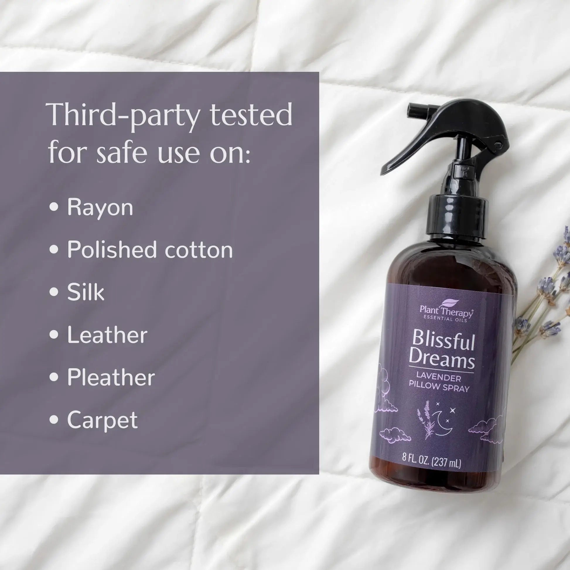 Having a hard time winding down before bed? Encourage a restful night's sleep with our Blissful Dreams Lavender Pillow Spray. This spray was expertly formulated to promote relaxation for the mind and body, thanks to its gentle, soothing Lavender aroma. Composed of the highest quality essential oils and isolates, you can rest easy knowing you are using a natural spray without any harsh ingredients or synthetic fragrance. Mist this pillow spray onto your pillows and bed sheets before going to bed. Its lovely, gentle aroma is just right for falling asleep without overpowering your senses. Our Blissful Dreams Lavender Pillow Spray has been third-party tested for safe use on rayon, polished cotton, silk, leather, pleather, and carpet. However, we recommend testing on a small, inconspicuous patch first.