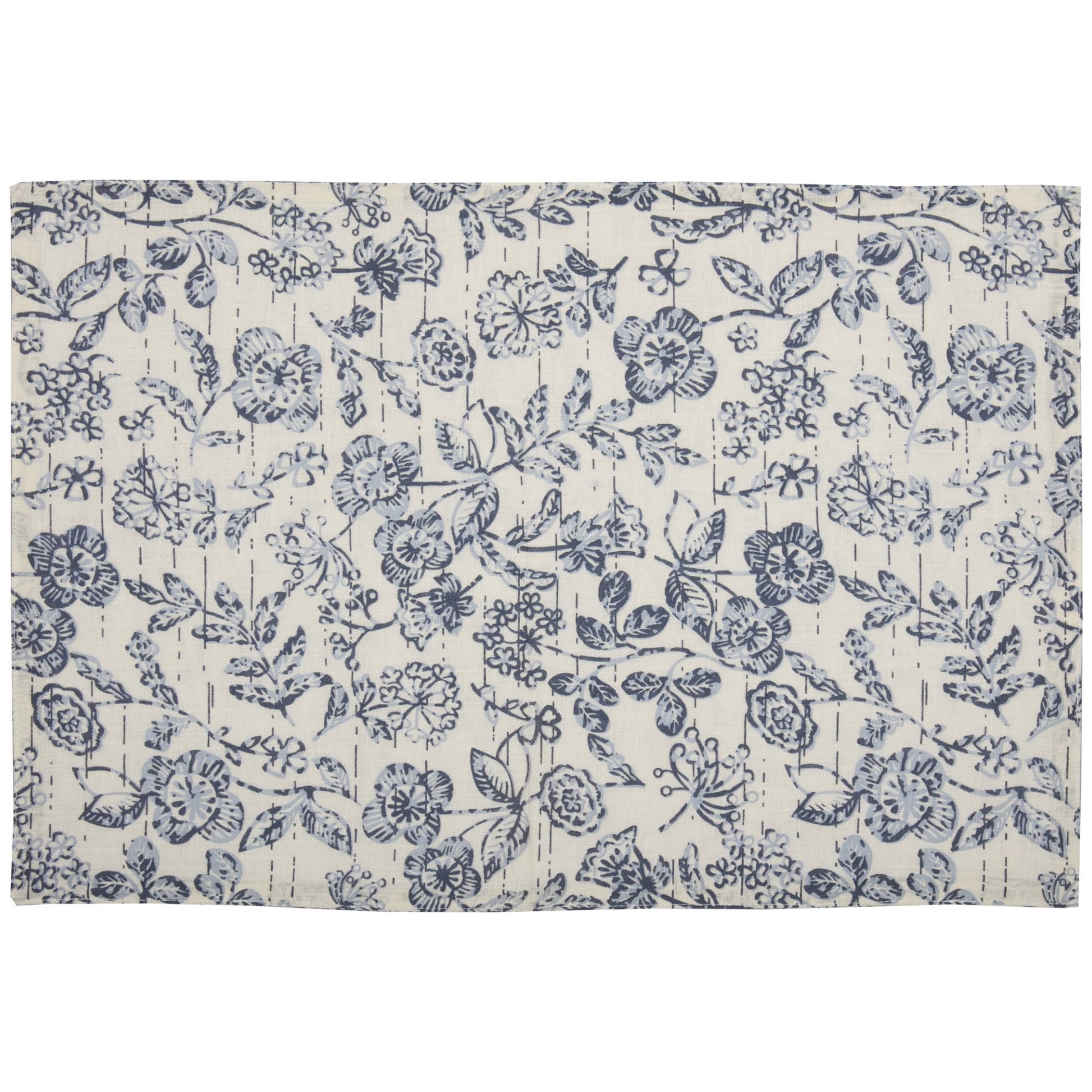Recall the comfort of home with this Doylestown Floral Placemat, lovingly crafted in shades of denim blue and creme. Measuring 18Lx12W, they bring a hint of farmhouse charm to any table setting. Made from 100% cotton, they're the perfect blend of style and practicality. Can you almost feel the slub weave texture, slightly distressed for a touch of nostalgia? And isn't it wonderful that they're machine washable and iron safe? And what's that on the reverse? A charming floral pattern in blue and creme. It's home, it's comfort, it's the perfect setting for your next family meal. Includes: Placemat Care Instructions: Machine Wash, Tumble Dry Low, Iron Safe Material: 100% Cotton Shell, Cotton Flannel Batting