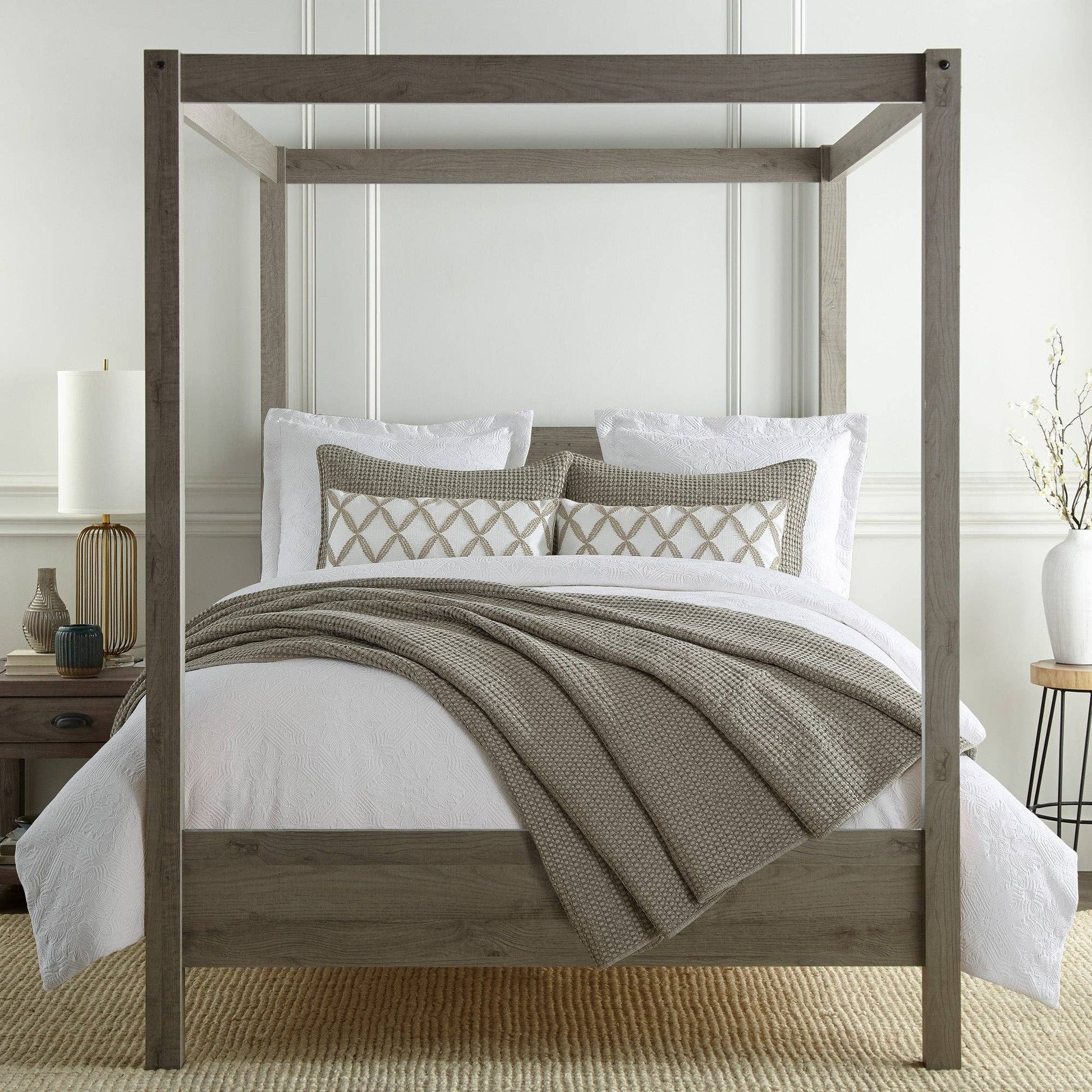 The Diamond Leaf decorative pillow perfectly matches the Levtex Home English Forest Natural bedding collection. This pillow is sized at 12 x 24in. and features a crewel stitched diamond leaf pattern in taupe on a cream ground. The taupe and cream color palette makes this a versatile accessory for your bed, couch or favorite chair. The pillow comes pre-filled with a soft, luxurious feather inner.