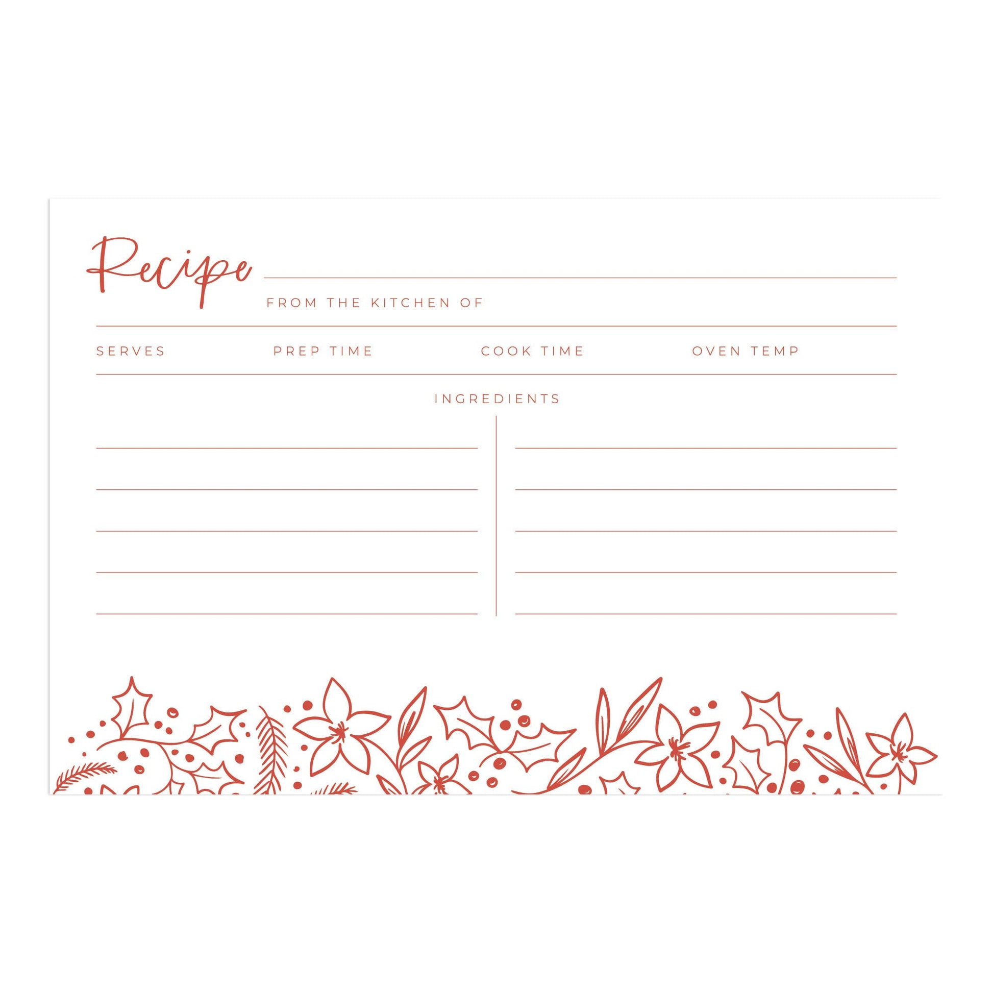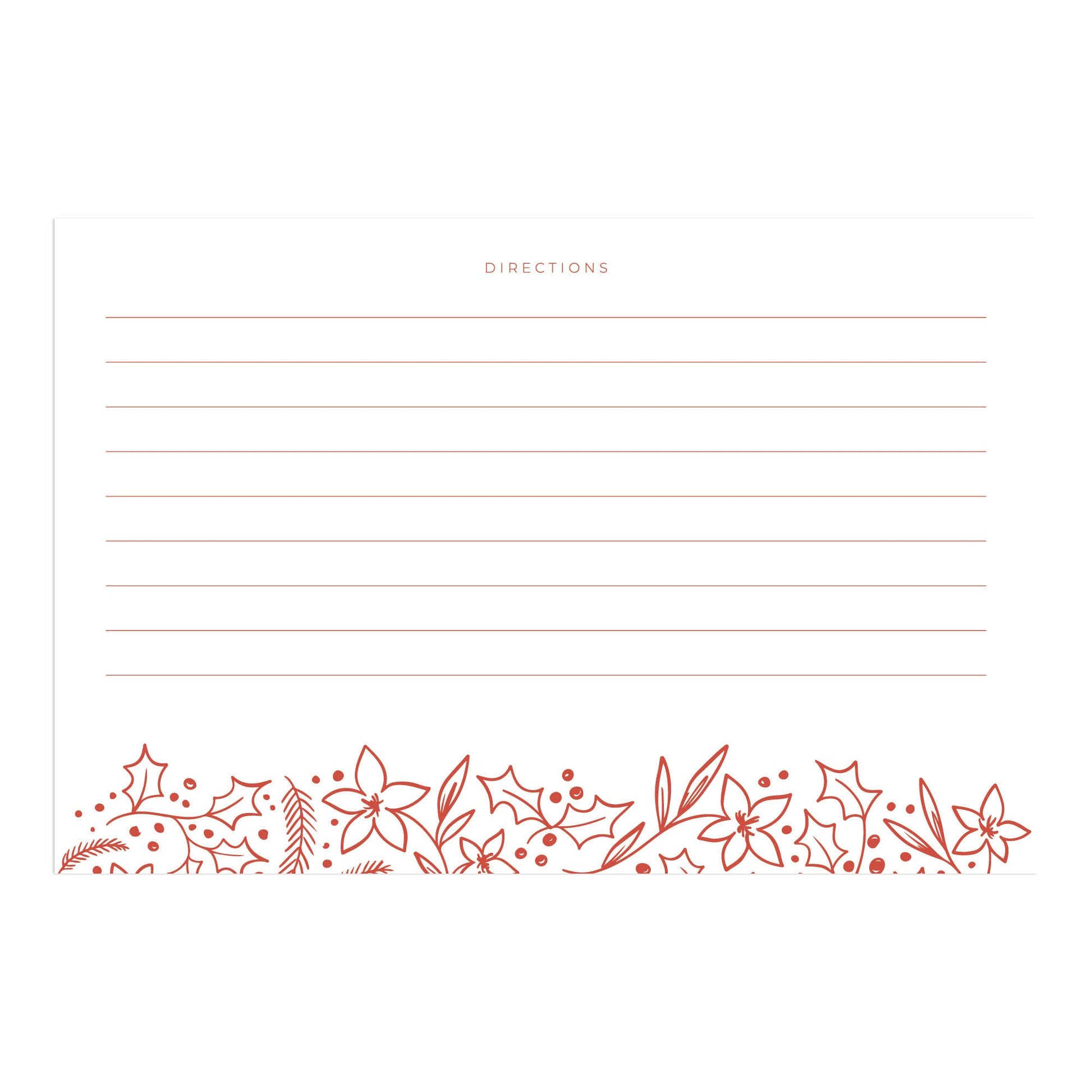 Bring a touch of festive flair to your kitchen with our Holiday Floral Recipe Cards! This set of 50 cards is perfect for jotting down your favorite holiday recipes or preserving cherished family traditions. Featuring a delicate floral design, these recipe cards add a Christmas flair to your culinary collection. With ample space for ingredients, instructions, and personal notes, they're ideal for capturing the spirit of the season in every dish. Coordinate with our Holiday Floral Tin Recipe Box for a complete recipe storage solution. Whether you're gifting them to a friend or treating yourself to a holiday treat, these recipe cards are sure to inspire creativity in the kitchen and make the holiday season even more merry.