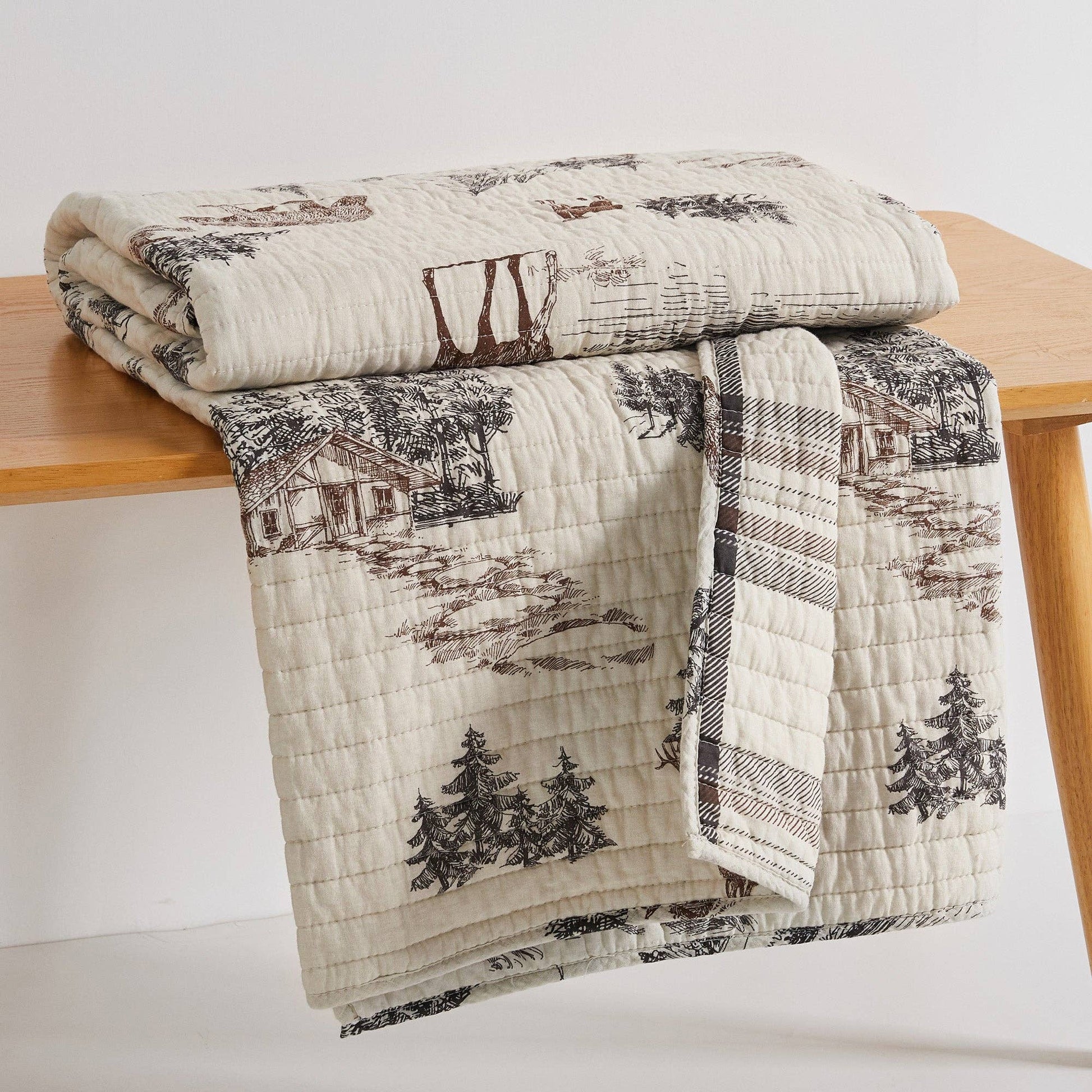 The Lodge Toile Reversible Throw by Levtex Home is inspired by the serene and rustic nature of a mountain get away. Offered in brown, cream and charcoal, this design will immediately transform any room in your home. This throw features moose and bears strolling in the mountains on the front, reversing to a brown cream and charcoal tartan plaid on the back. The Throw (50x60in.) has a cotton front and back, filled with a cotton-rich filler, and is machine washable. Enjoy this for years to come!