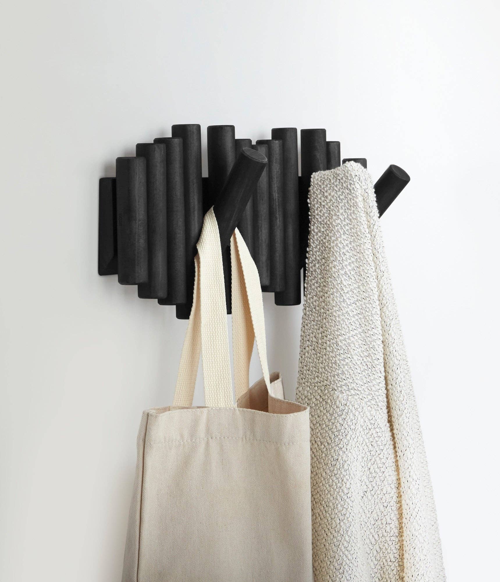 Five Flip-Down Hooks: Picket is a wall mountable hook rail coat rack with five flip hooks; each holding up to 5 lbs
