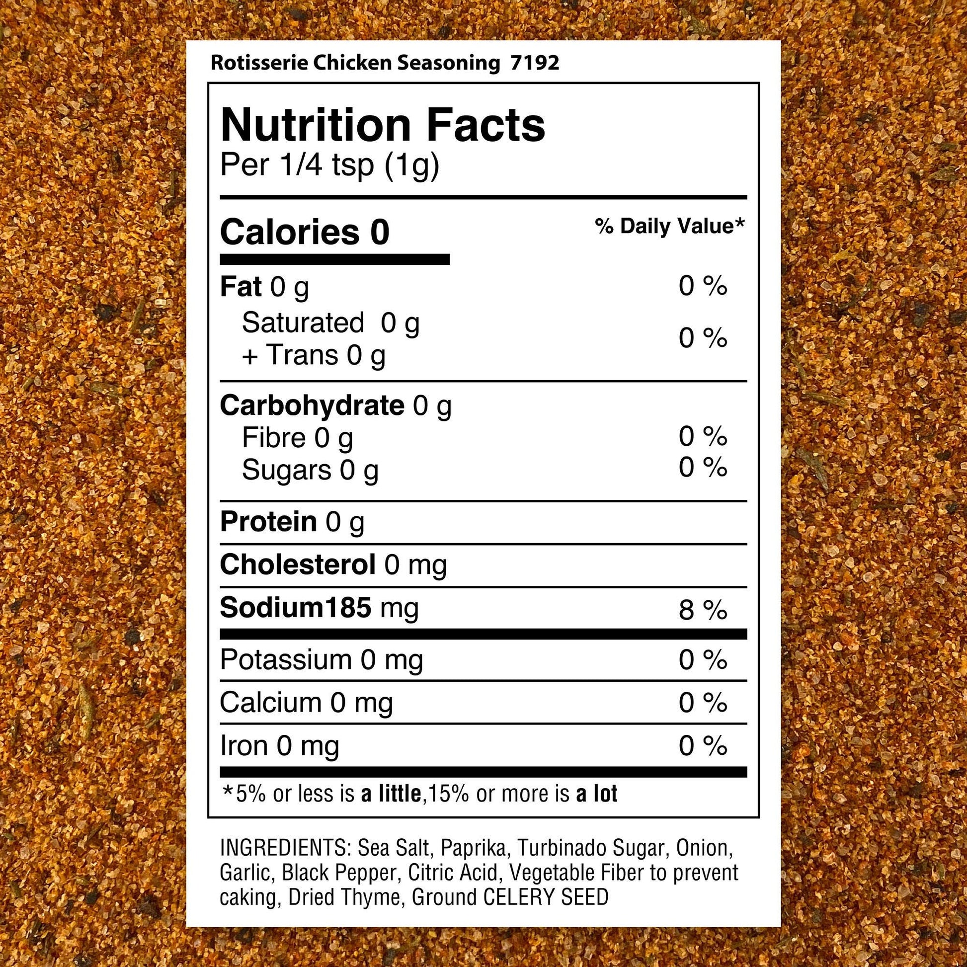 • DELICIOUS AND NOSTALGIC: Rotisserie chicken is a food item that is a staple across many cultures. The scent of the cooking chicken always evokes a feeling of warmth and comfort. Our Rotisserie Chicken Seasoning is savory, with a touch sweetness and tang.