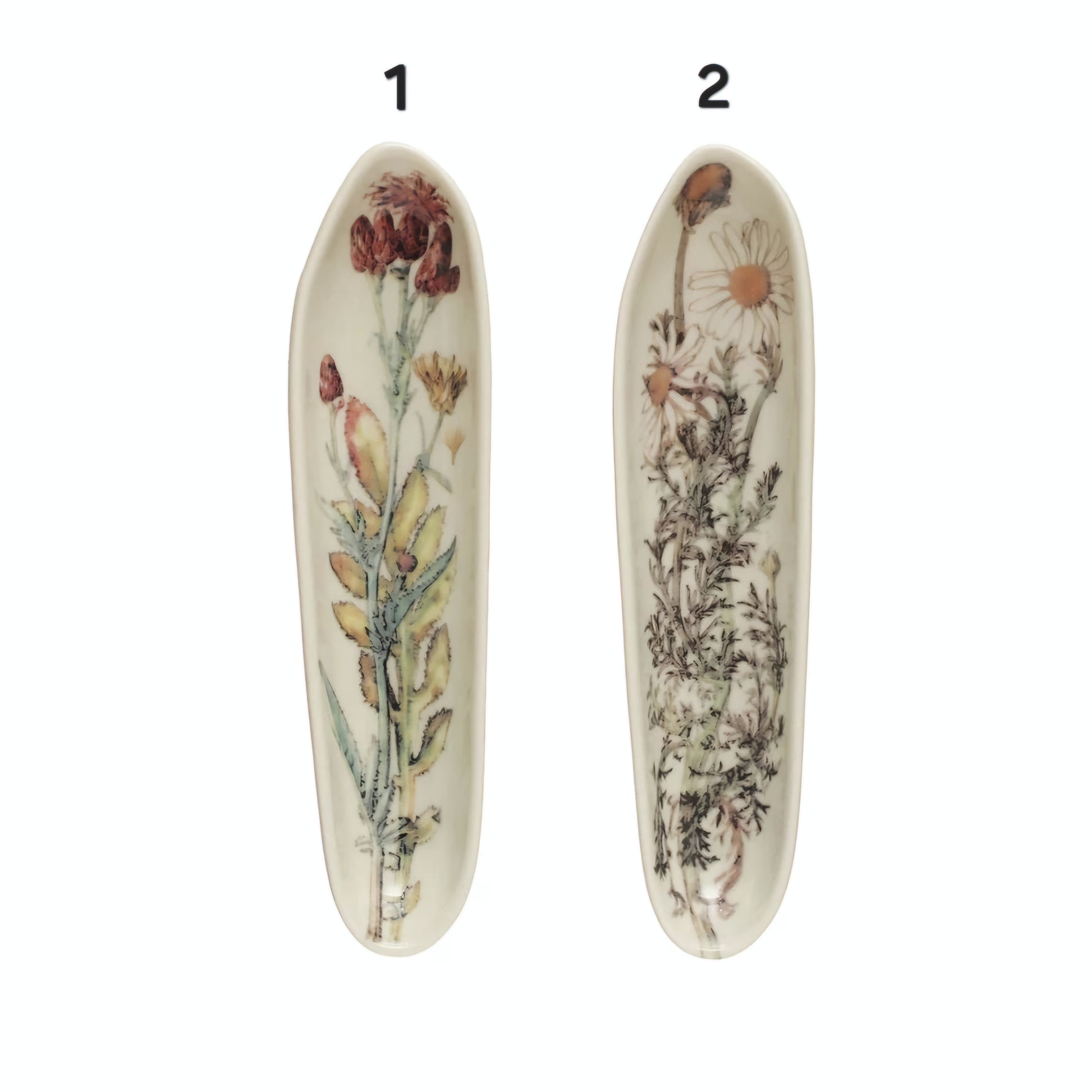 8"L x 2"W Stoneware Organic Shaped Platter w/ Floral Image, Multi Color, 2 Styles