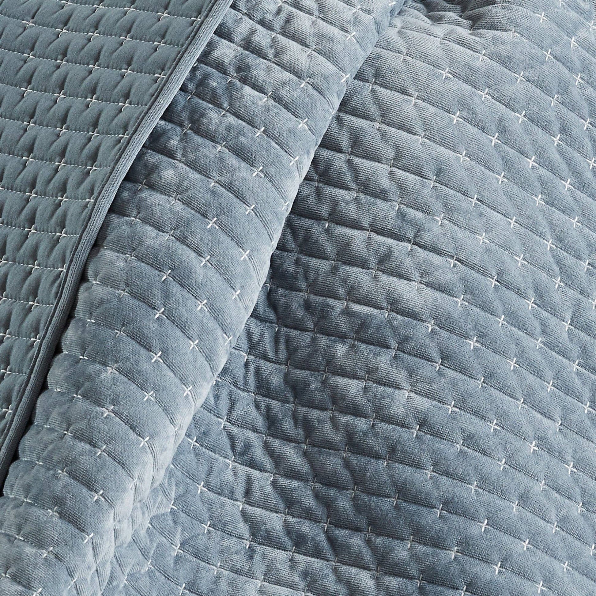 The Velvet Stitch Reversible Throw blanket is inspired by a luxurious retreat filled with rich fabrics. Offered in green, rust, taupe, and chambray colors, this throw features a rich velvet with white cross stitch throughout on the front, reversing to a solid back. This throw has a microfiber front and back, filled with a cotton-rich filler, and is machine washable.