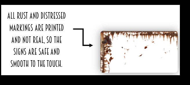 NOTE: All rustic add-ons including any rust, distressed marks, etc. are printed on and not real, so the signs are smooth to the touch.