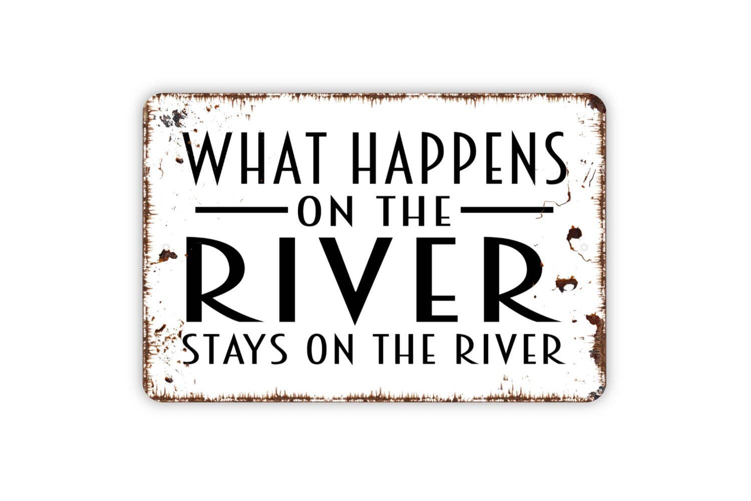 What Happens On The River Stays On The River Sign: White With Faux Rust / 8" x 12" w/Holes As Shown